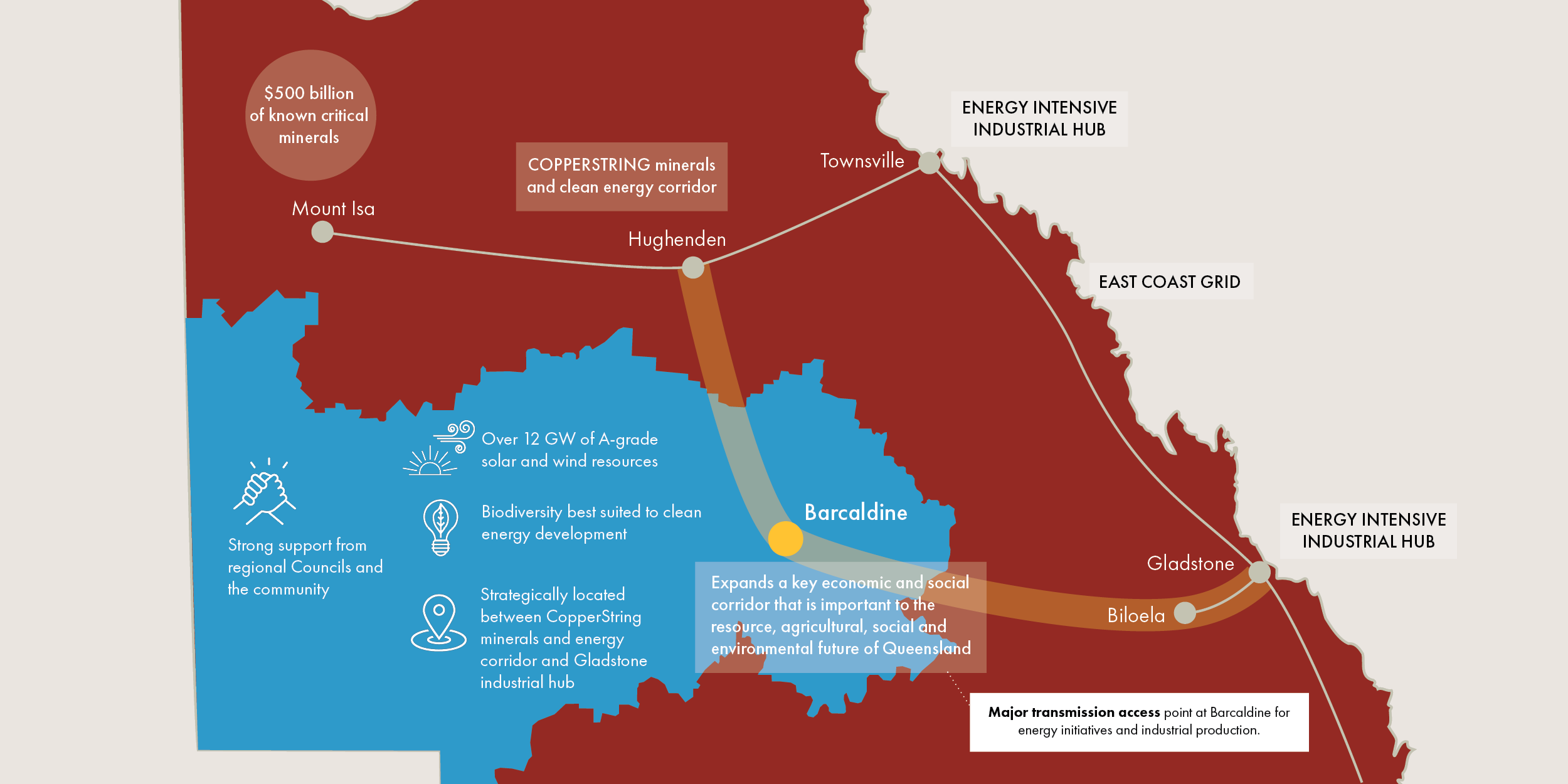 capitalise on investment potential in energy initiatives and clean industrial production both locally and in the major industrial hubs of Gladstone and Townsville, plus provide reinforcement of the local CWQ distribution system.